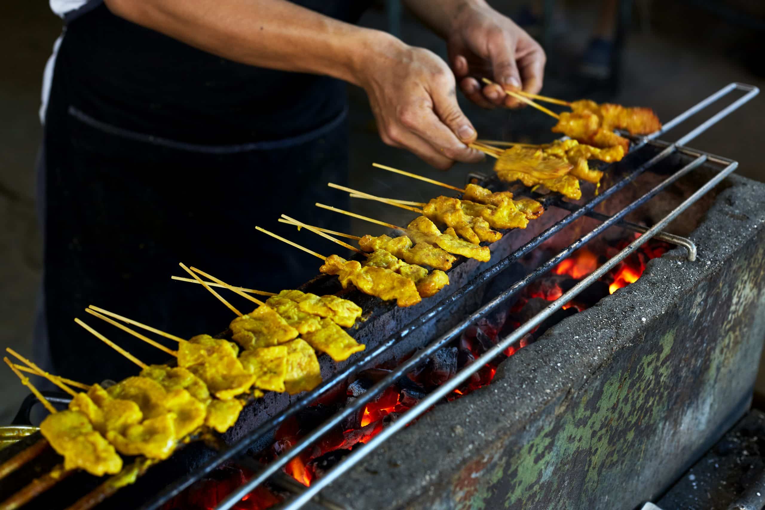 - Satay : Des brochettes de viande marinée, grillées sur de petits braseros et servies avec une sauce au cacahuète onctueuse.