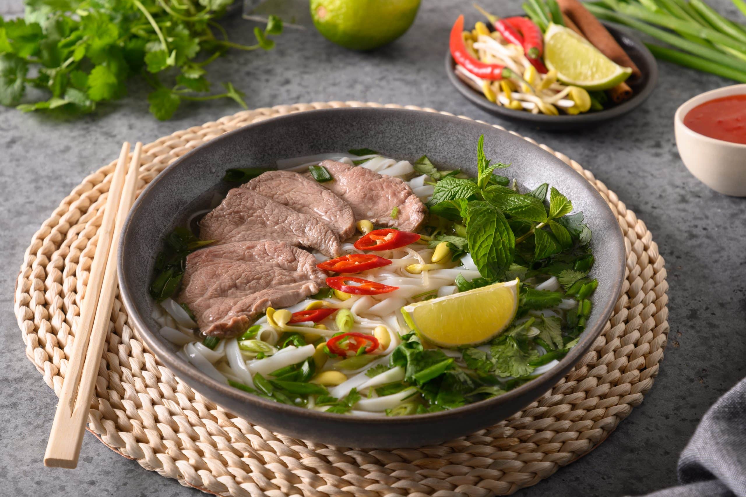 - Phở : Soupe de nouilles emblématique du Vietnam, servie avec du bœuf ou du poulet, dans un bouillon parfumé à l’anis étoilé, au gingembre et à la cannelle.