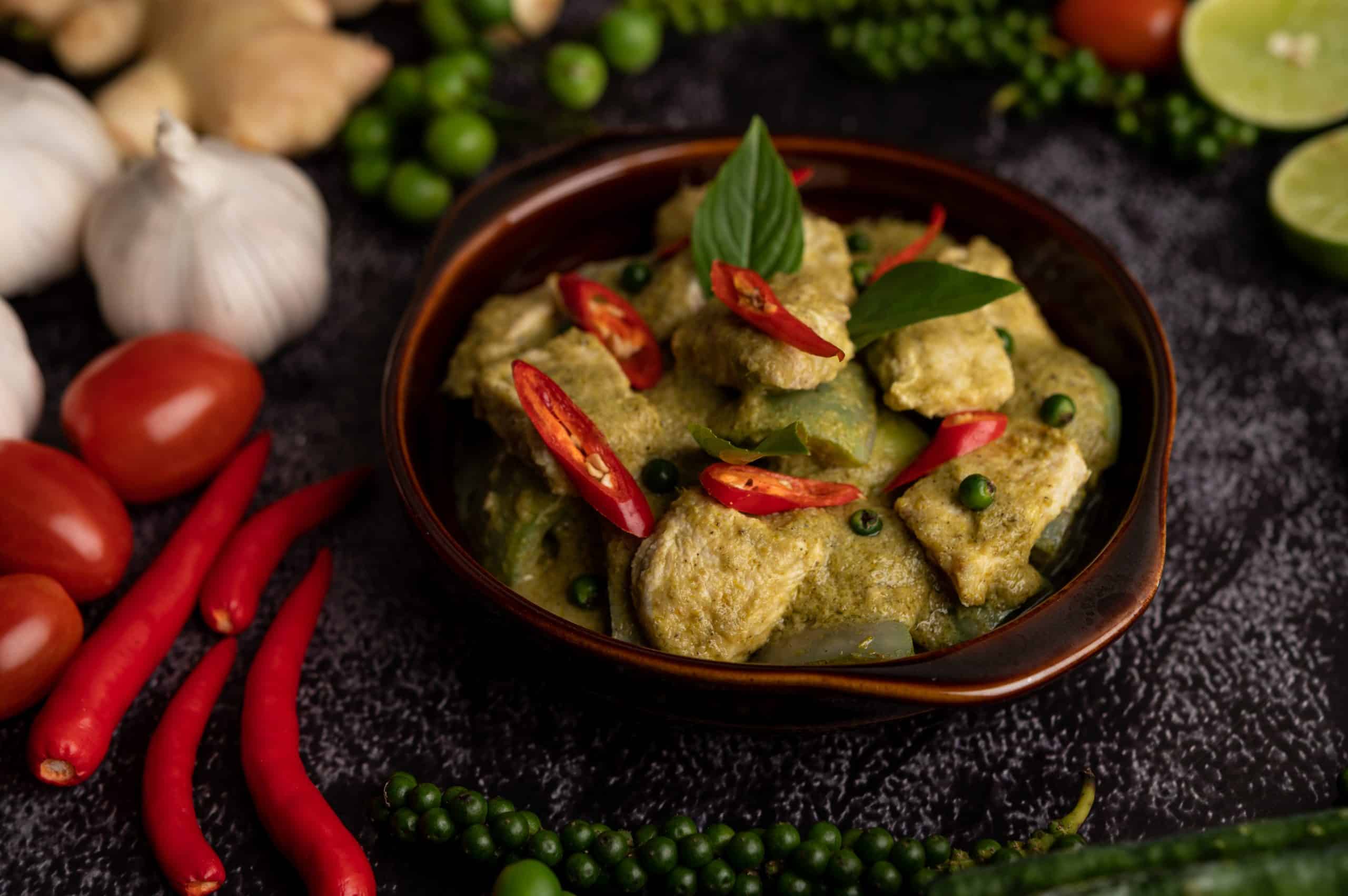 Curry Vert : Le curry vert thaïlandais, ou Gaeng Keow Wan, est célèbre pour sa couleur vibrante et son goût riche. Le cœur de ce plat réside dans sa pâte de curry, un mélange complexe de piment verts, de citronnelle, de galanga, d’échalotes, de feuilles de lime kaffir et de coriandre, finement broyés ensemble. Cette pâte est ensuite mélangée avec du lait de coco, créant une sauce onctueuse qui enveloppe morceaux de poulet, aubergines, pois gourmands et basilic thaï. La douceur du lait de coco tempère la chaleur des piments verts, offrant un plat riche en nuances et en profondeur. Servi avec du riz, le curry vert est une invitation à explorer la complexité de la cuisine thaïlandaise.